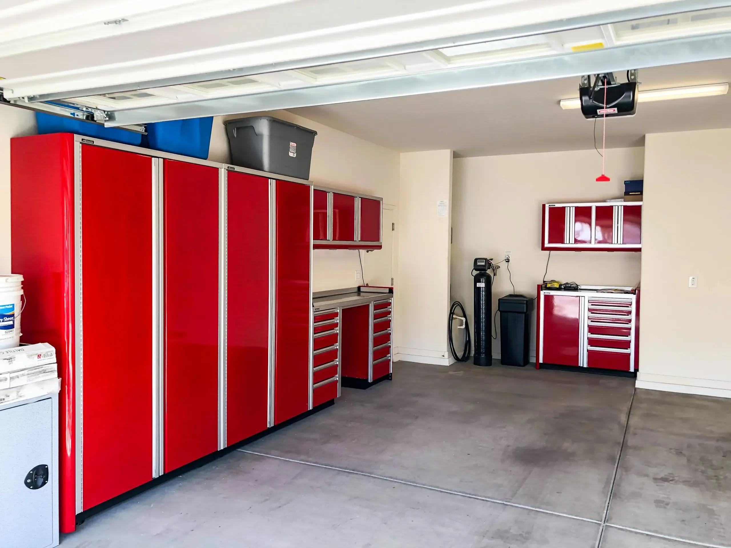 Quais são os recursos e detalhes do armário de garagem?